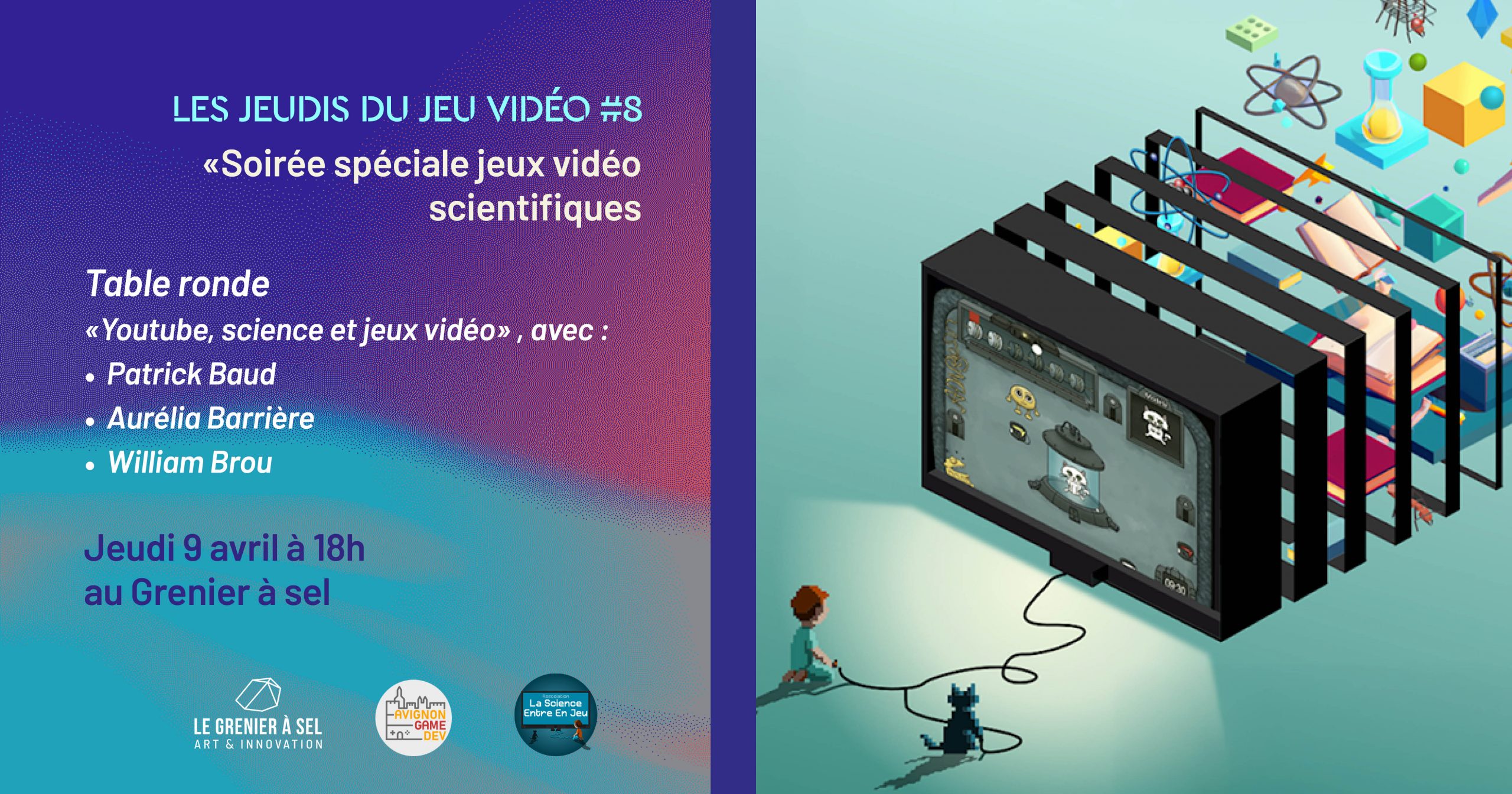 Les jeudis du jeu vidéo sont organisées par Avignon Game Dev, en collaboration avec la Science entre en jeu, Sudanim et le Grenier à sel.