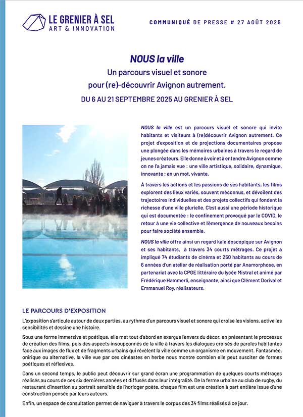 Bienvenue sur l’espace presse du Grenier à sel. Notre directrice et son équipe se tiennent à votre disposition pour échanger sur nos projets. N’hésitez pas à nous contacter !